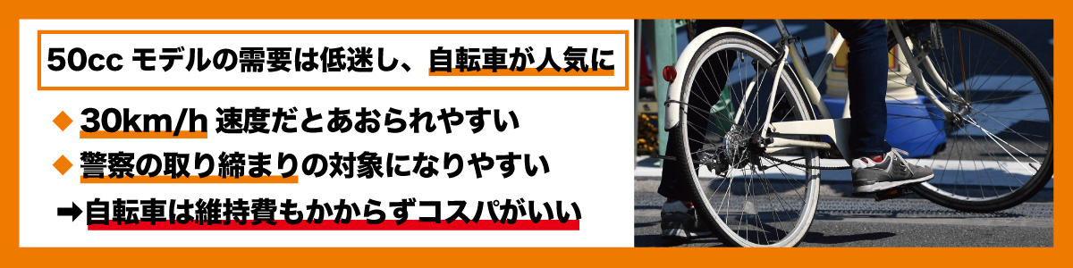 50ccモデルの不便さを避けるために自転車へ乗り換える動きが進む一方で、自転車を取り巻く環境にも変化の波が押し寄せています。