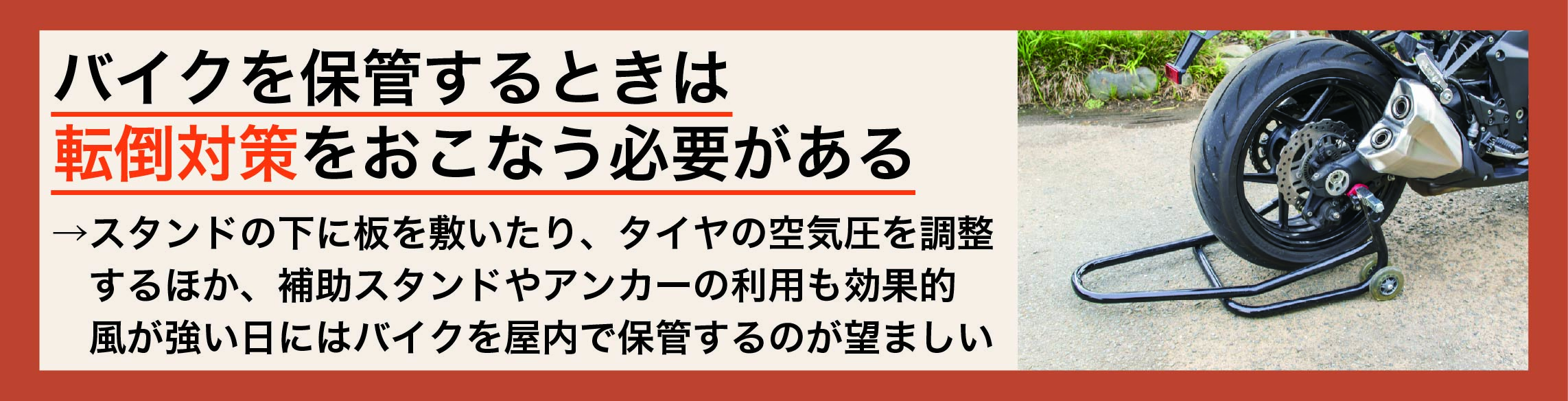 バイクを保管するときには、転倒対策をおこなう必要がある