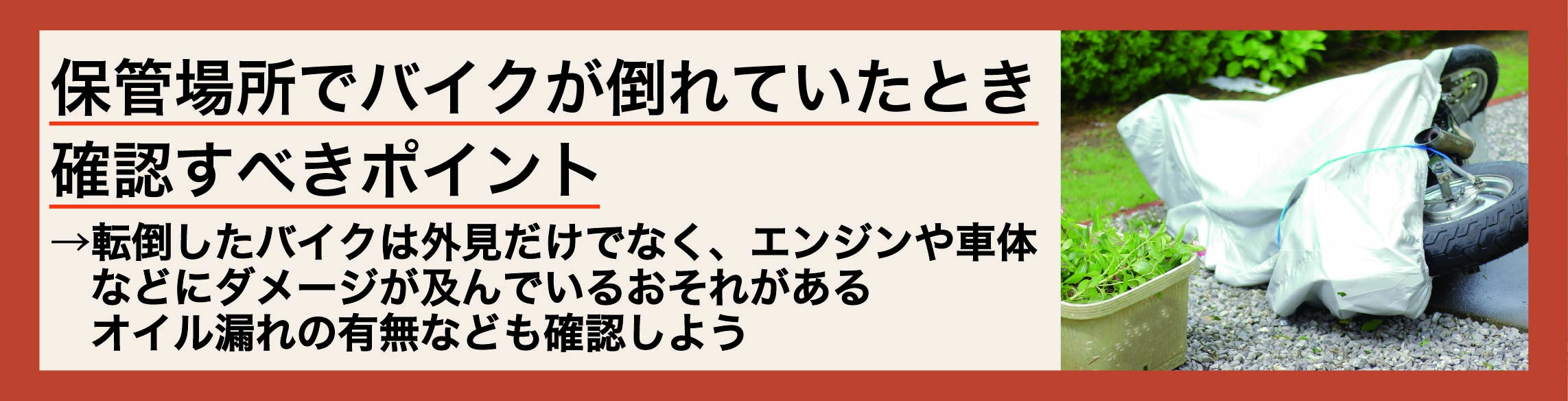 昨今頻発する地震や、秋にかけて日本を襲う台風によって、屋外で保管されているバイクが転倒するおそれはゼロではありません。