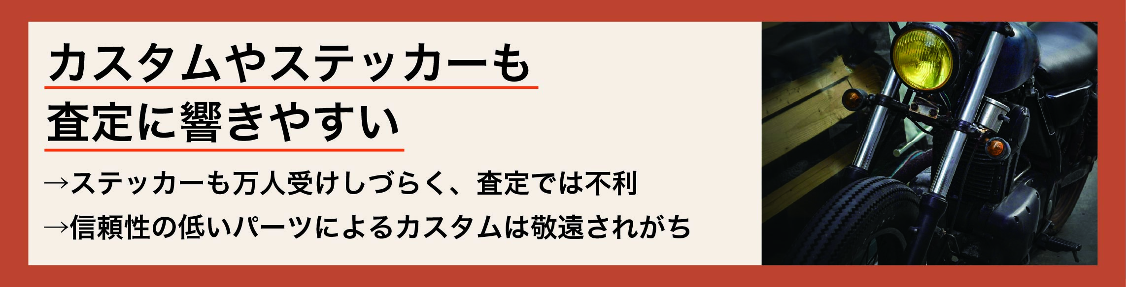 くわえて、ステッカーやノーブランド品による改造も、査定を低くするおそれのある要素とされています。