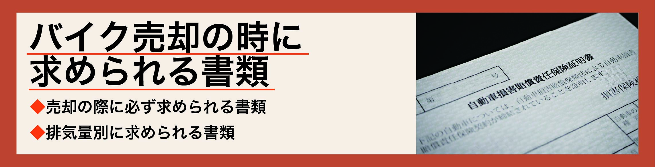また、売却時には本人確認書類や自賠責保険証明書のほか、排気量に応じた各種書類を用意する必要があります。