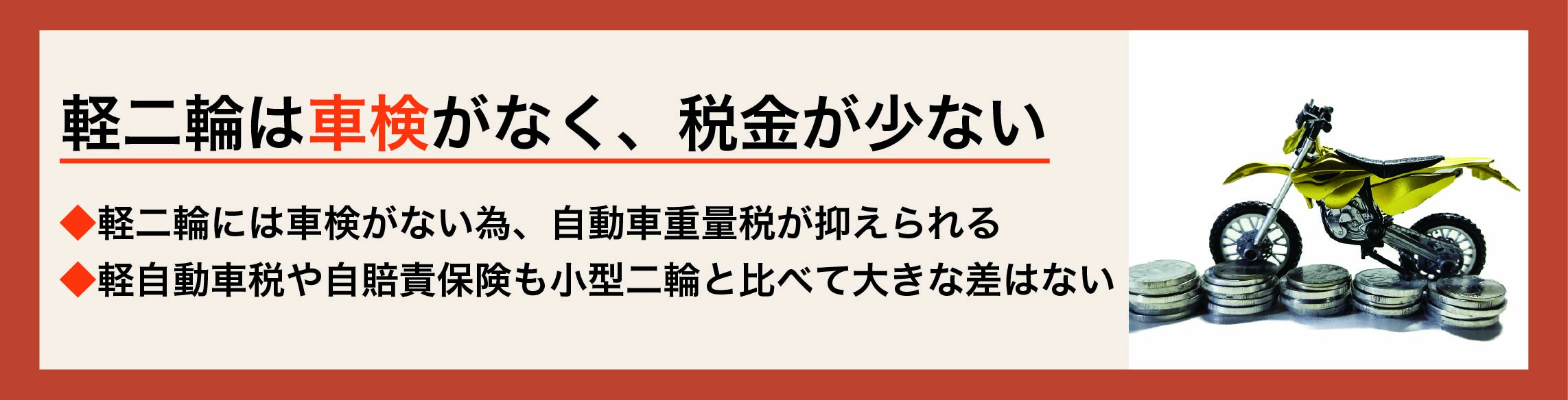 毎年支払う軽自動車税は、軽二輪が3600円、小型二輪は6000円と明確な差があります。