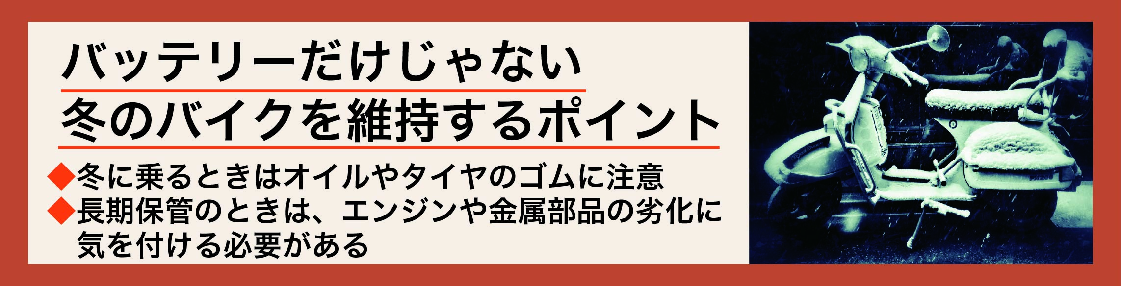 そして、冬にバイクを維持するときに気を付けた方がよい点はバッテリーだけではありません。