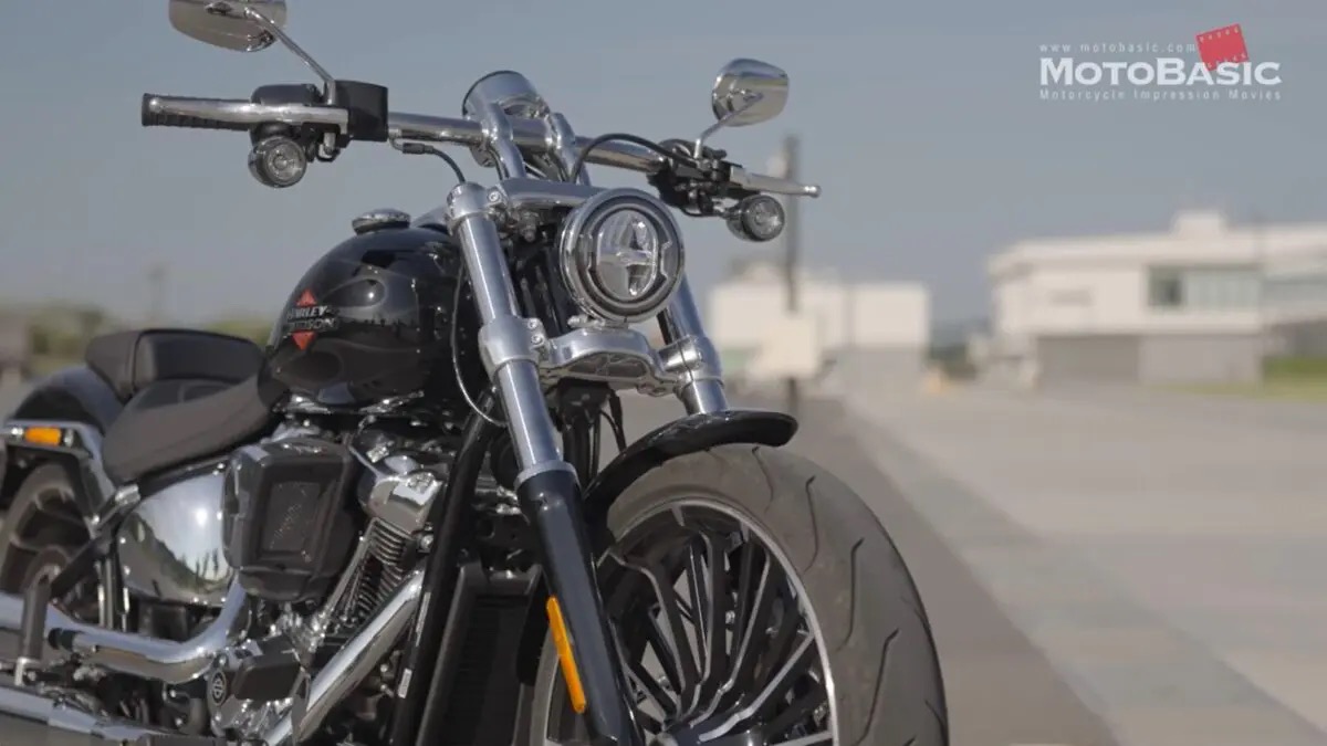 新型ブレイクアウトのフレームは、極太リアタイヤと21インチフロントホイールにより低く構えた塊感が特徴である。通常型フロントフォークの採用で車体剛性が高く、走行中の安定感と高質感を両立。ライダーは路面に近い着座位置でフォワードコントロールにより前傾姿勢を自然に取り、スポーティかつやんちゃな印象を与える。倒し込みはリアタイヤ幅によりやや重めだが、確実なハンドリングと快適性を確保している。