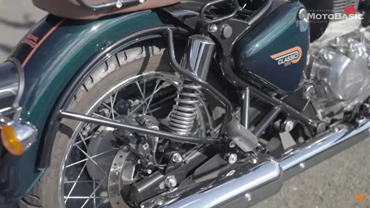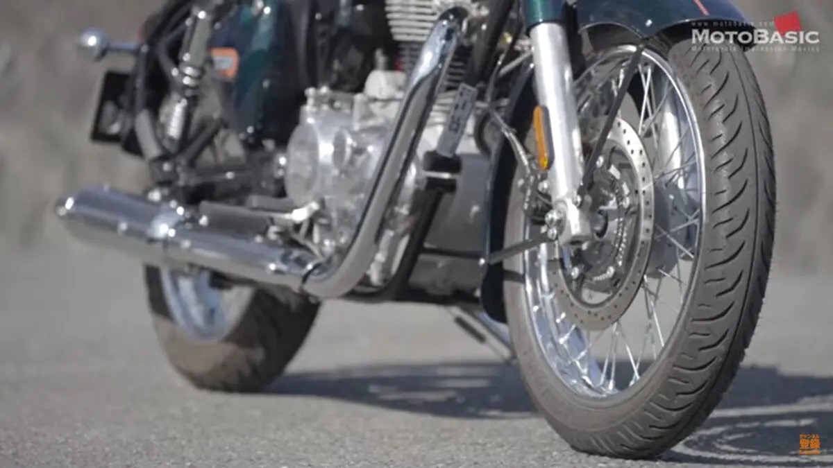 フロントはクラシカルな正立テレスコピックフォーク、リアはツインショックを装備。タイヤはフロント100/90-19、リア120/80-18を履き、やや重めのバネレートながら路面追従性は高く、不快な突き上げもない。高速域での安定感と一般道での快適性を巧みに両立している。センタースタンドを標準装備し、サイドスタンドも質感上々。リアにはサドルバッグ用サポートバーを備え、ツーリングユースにも抜かりない。