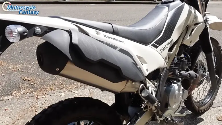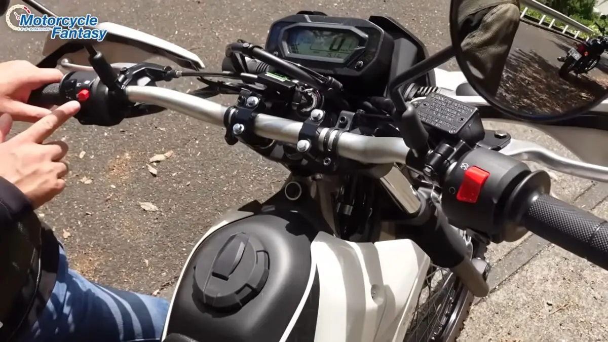ハンドルはKLX230シリーズの中で、唯一テーパードハンドルバーを採用。剛性感とともに軽快なハンドリングに大きく寄与している。スピードメーターは液晶タイプで、タコメーターも液晶のバーグラフ式となる。ウインカーのシグナルは左右別々に用意されている。