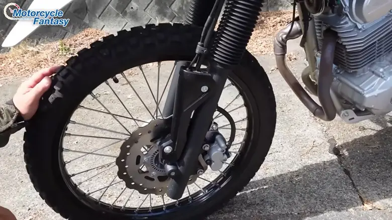 オフロード対応モデルなので、フロント21インチ、リア18インチのスポークホイールを採用。タイヤサイズはフロント2.75-21、リア4.10-18のブロックパターンタイヤをそれぞれ履く。シート高が低いバージョンのKLX230シェルパSのみ、リアタイヤにチューブレスタイプを採用している。