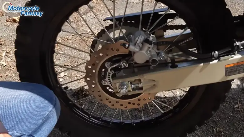 サスペンションは日本国内に流通するオフロードモデルとしては、今となっては数少ない正立式テレスコピックタイプをフロントに採用。リアはリンク式のシングルショックをそれぞれ搭載。フロントは正立式なだけに、これまた今のオフロードモデルには数少ないフォークブーツを装備している。