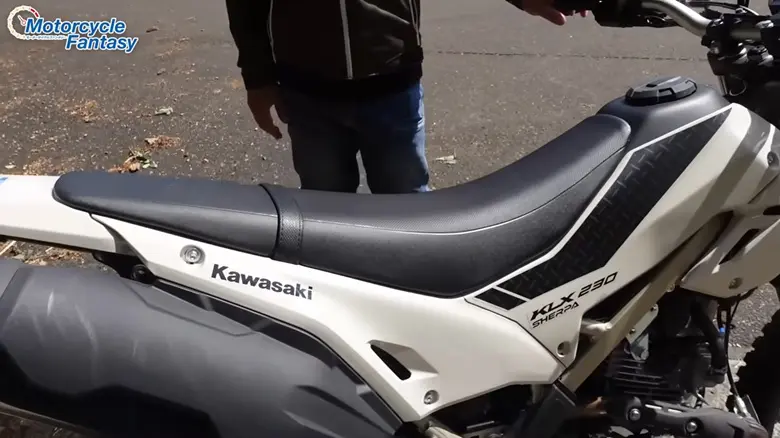 スリムな車体だけに燃料タンクは決して大きくはないが、それでも7.6ℓ分の容量を確保。給油口は跳ね上げ式なので、キャップだけを紛失するような心配はない。シートは2019年に登場した最初のKLX230は高さが885mmという、日本人の体形にはかなり厳しいスペックであった。しかし、このシェルパでは通常モデルが845mm、ローダウン仕様の「S」が825mmと、大幅に改善されている。