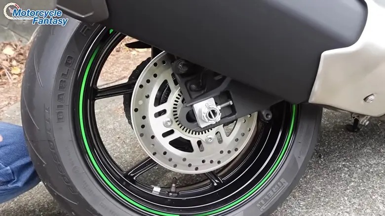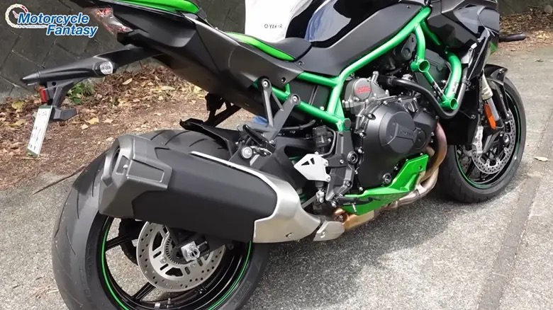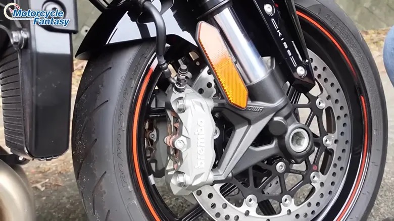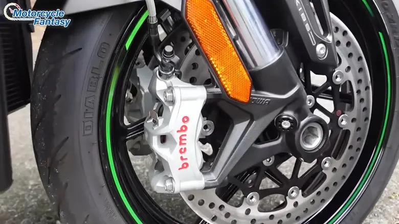 ホイールサイズはフロント、リアともに17インチで、アルミ製キャストホイールを採用。タイヤサイズはフロント120/70ZR17、リア190/55ZR17で、いずれもラジアルのチューブレスとなる。フロントのブレーキキャリパーはZ H2がブレンボ製の4ポット式モノブロックM4キャリパー&ニッシン製マスターシリンダーなのに対し、「SE」は同じブレンボ製でもよりグレードの高い4ポッド式モノブロックStylemaキャリパー&ブレンボ製マスターシリンダーを採用。よりダイレクトなブレーキタッチを実現している。