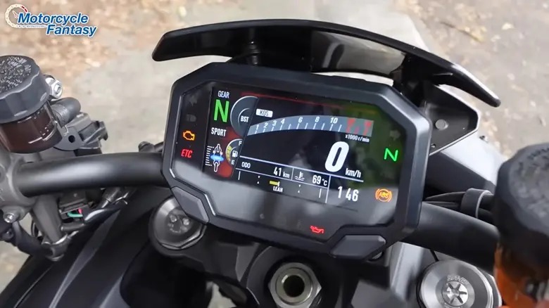 ハンドルはテーパードタイプのパイプハンドルを採用。大きめのTFT液晶ディスプレイが中央に鎮座し、ここにスピード、回転数などが表示されるのはもちろん、あらゆる情報が表示される。ライディングモードの表示切替もここで行うことができる。表示やモードの切り替えは、左側のスイッチボックスで行う。
