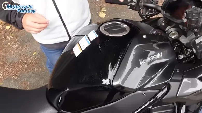 燃料タンクはスチール製だが、前半部分には先述のヘッドライト~タンクまでのカウルが被さるようにマウントされている。燃料タンク容量は19Lで、ハイオクガソリン指定となる。シートは前後分割式で、硬そうなイメージだがクッション性は高く座り心地は悪くない。タンデムシートはキーで外すことができ、中には標準装備のETCが搭載されているのでスペースは広くなく、書類が入れられる程度だ。
