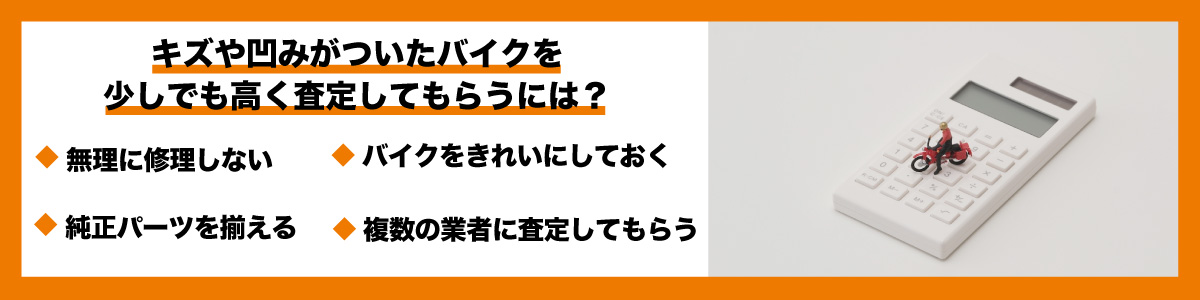 キズや凹みがついてしまっているバイクを少しでも高く査定してもらうには、4つの重要なポイントを押さえておくことが効果的とされています。