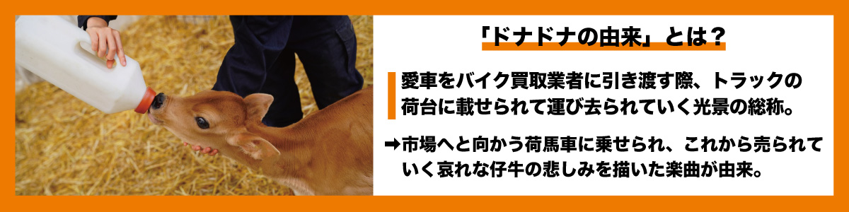 愛車を手放す際、トラックやレッカー車に乗せられて遠ざかっていくバイクを見送る様子を「ドナドナ」と呼ぶことがあります。