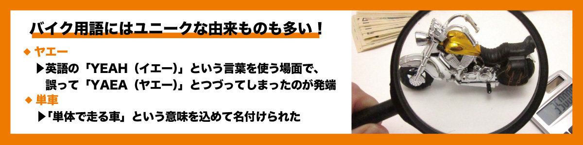 ヤエーや単車など、バイク用語にはユニークな由来ものも多い