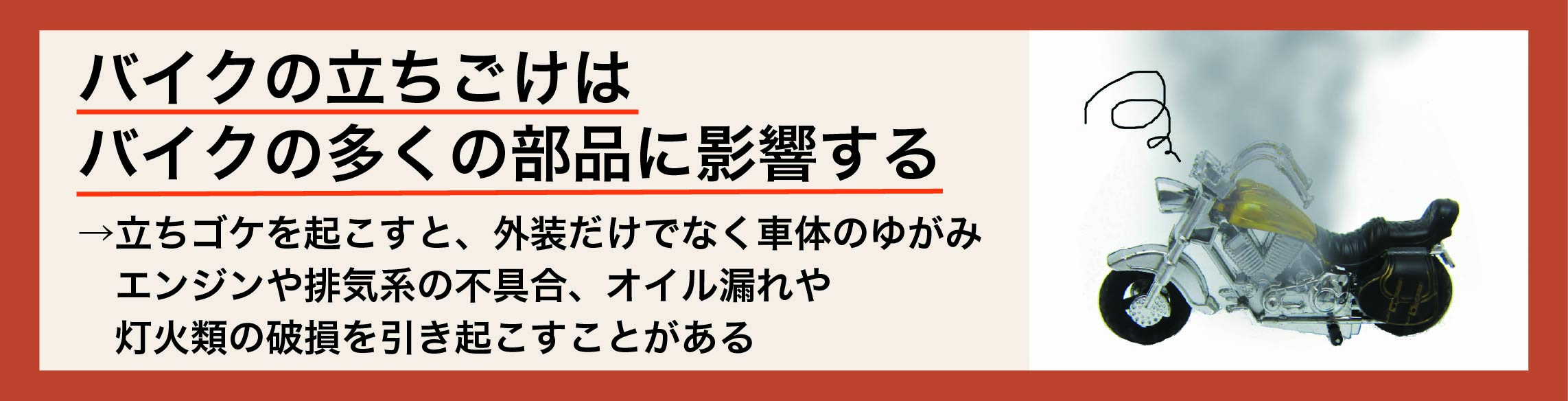 バイクの立ちゴケは、多くの部品に影響する