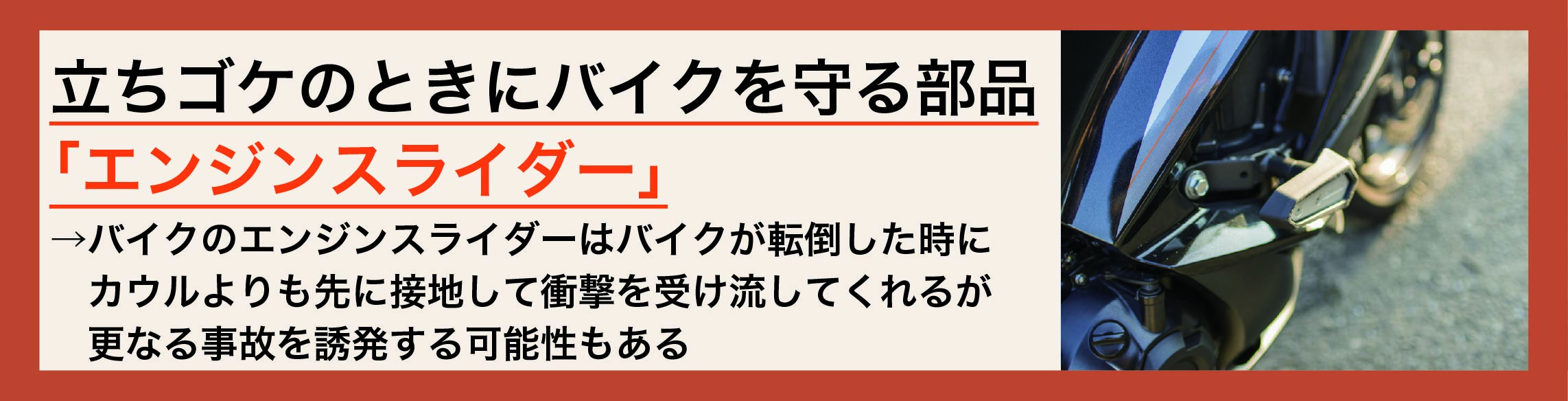 バイクで立ちゴケを起こしたとき、どの部品が影響を受けやすい?エンジンスライダーの効果は?